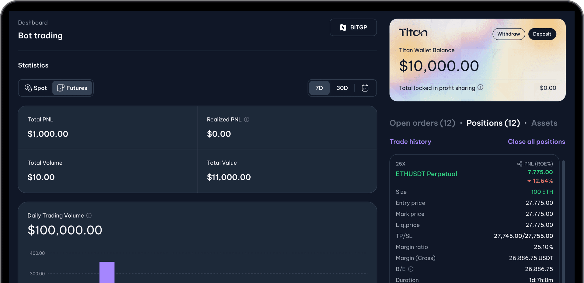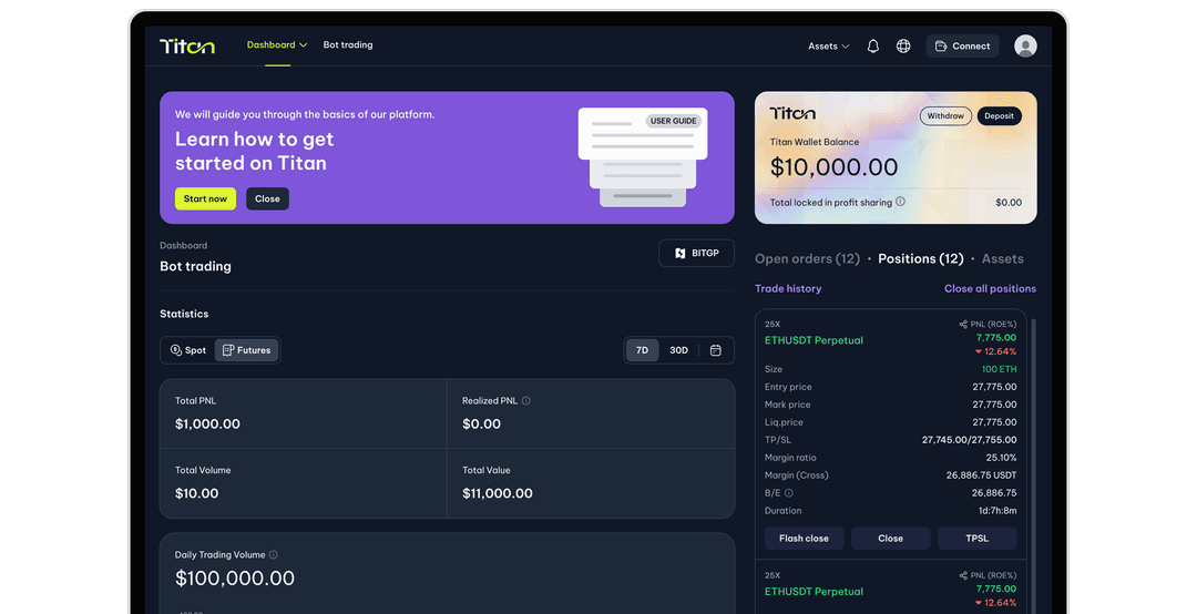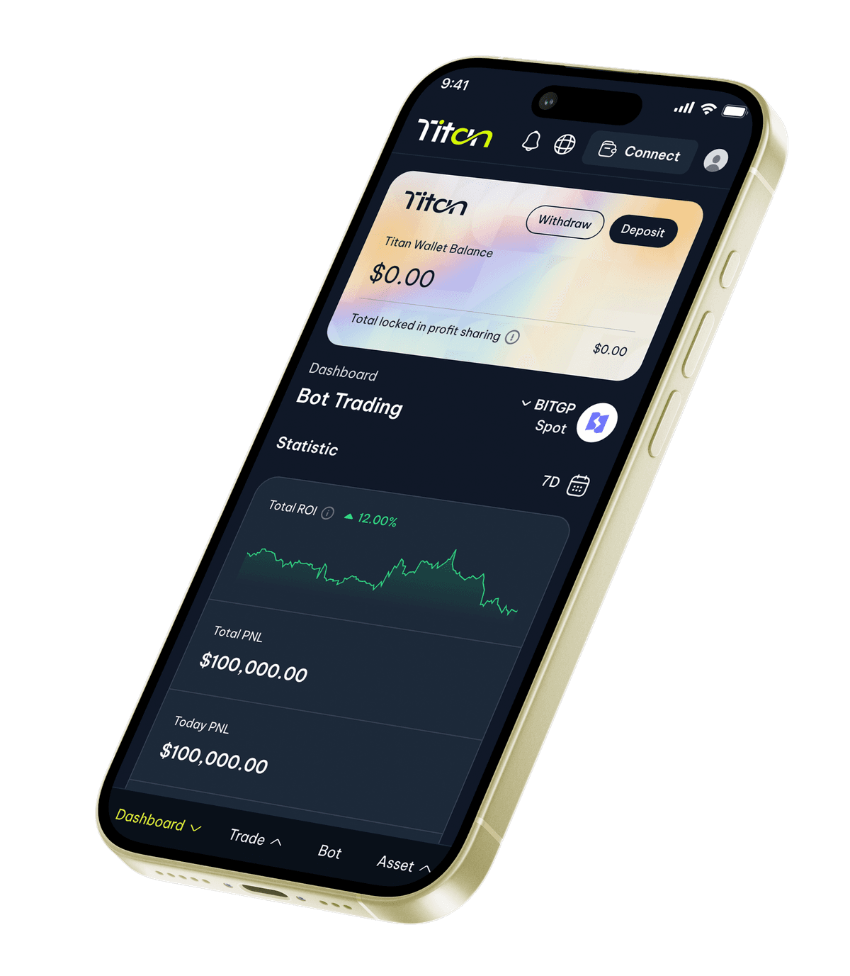 Titan là nền tảng giao dịch thông minh ứng dụng AI, mang đến cho bạn một hệ sinh thái toàn diện từ bot tự động, công cụ giao dịch cho đến cộng đồng kết nối. Đây là nơi giúp bạn khai thác tối đa tiềm năng thị trường tiền điện tử một cách an toàn và hiệu quả.